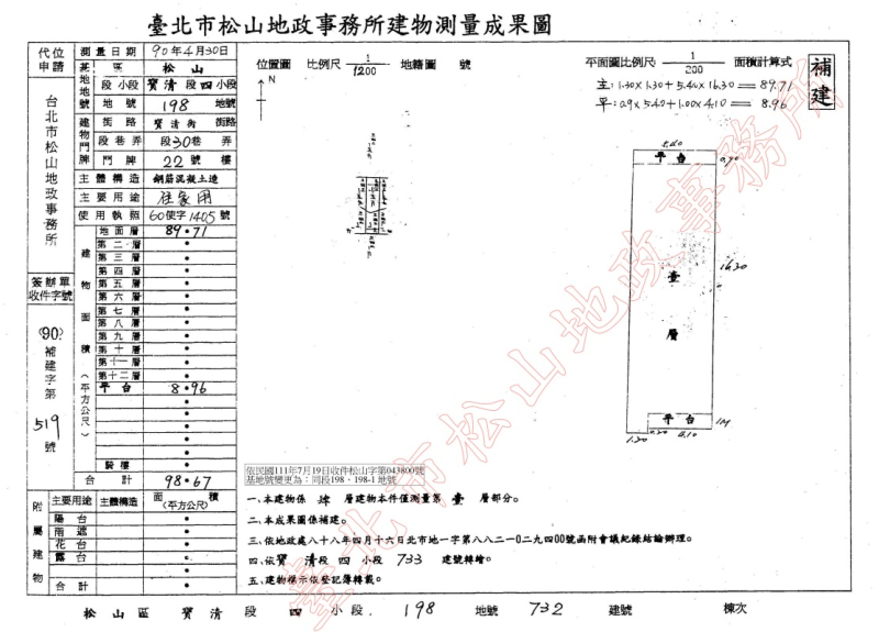 - 2056建號建物因未辦理建築物所有權第一次登記,拍定後拍定人無法逕持不動產權利移轉證書辦理所有權移轉登記,且經臺北市建築管理工程處111年4月12日北市都建查字第1116027256號函列為垂直增建違章建築,屬既存違章建築,並列入分類分期處理,列管拆除,拍定人應自行負擔被拆除危險,不得異議。又732建號下方有一地下室(由房屋外樓梯進入),經臺北市政府建築管理工程處人員確認為大樓防空避難室(原出入口位於門牌號碼20號及22號房屋間共用梯內,現已封死),不在本件拍賣範圍內。以上均請應買人注意。