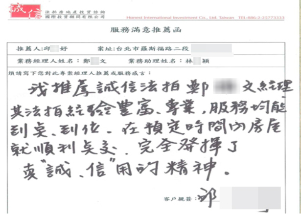 邱小姐從事室內裝潢業,想買間完全沒有裝潢的中古屋讓自己的弟弟從頭到尾都自己規劃設計裝潢,但很多仲介公司賣的房子價格都很高,而且大多都是投資客裝潢好的房子,所以就想到了法拍屋,於是開始請助理上網搜尋法拍屋的資訊,找到了誠信法拍屋,經由誠信法拍屋的鄭經理介紹,找到了難得一見的稀有案子而且經過調查得知屋主從買入後就完全沒有裝潢,正好符合邱小姐心中理想的案件,所以決定去投標,於98年8月得標中正區羅斯福路物件,市價行情約2900萬,得標價為1939萬,共省下961萬,本案件為第二拍,共6人投標。